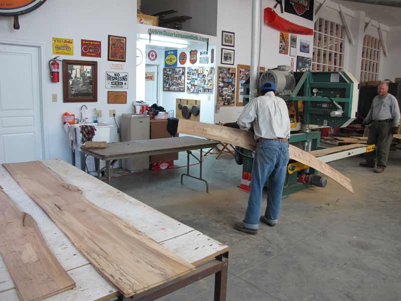 "22" wide, 4" thick quartersawn red oak slab being face jointed and planed in our 25" Oliver jointer-planing machine.  This slab was used as the top of a Roubo style woodworking bench